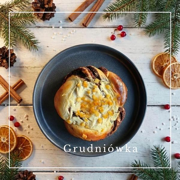 Skład: mąka pszenna* typ 450, mleko 3,2% *, cukier biały, masło 82%*, drożdże, jajka wolny wybieg kruszonka (mąka pszenna* typ 450, cukier puder, masło), ok. 500 g. Alergeny oznaczone gwiazdką.